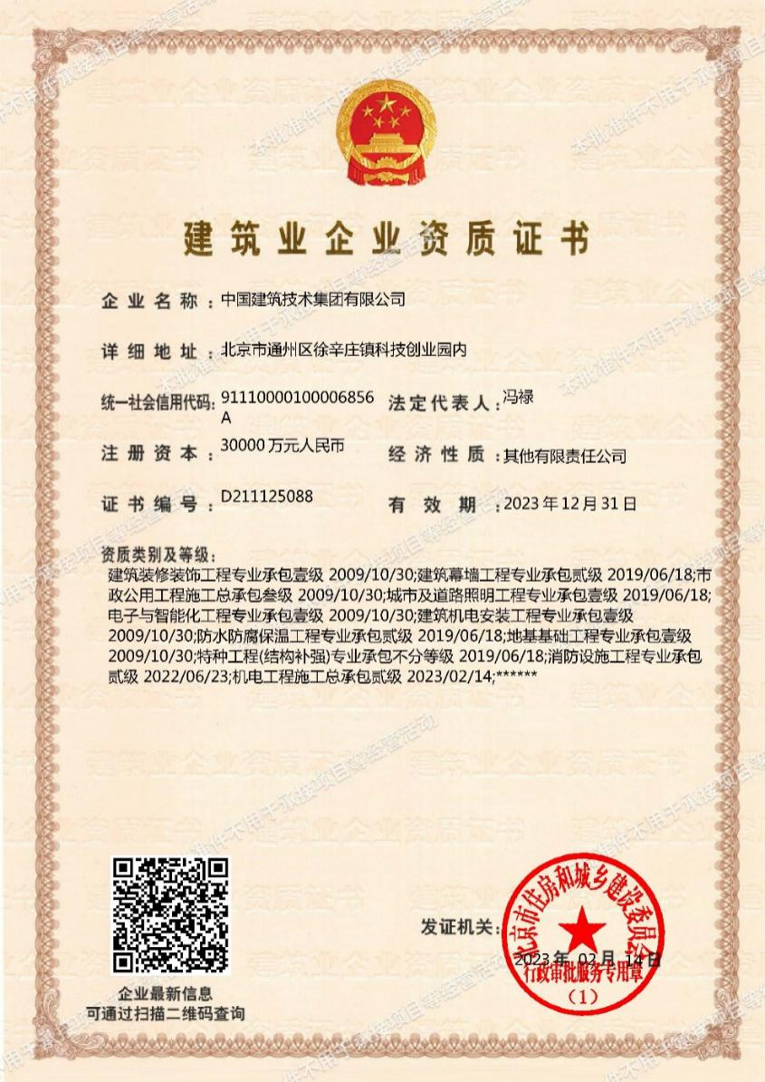 2月14日,經(jīng)北京市住房和城鄉(xiāng)建設(shè)委員會(huì)核準(zhǔn),集團(tuán)公司申報(bào)的“機(jī)電工程施工總承包貳級(jí)資質(zhì)”成功獲批。