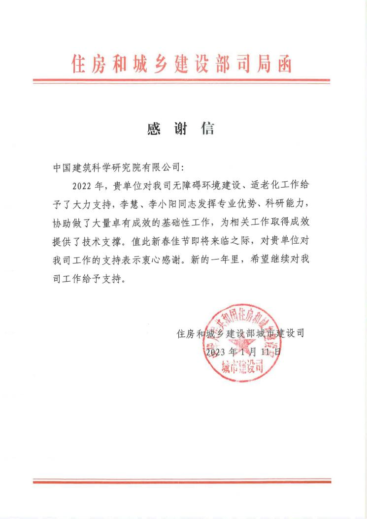 春節(jié)前夕,中國建研院收到住房和城鄉(xiāng)建設部城市建設司發(fā)來的感謝信,對中國建研院在無障礙環(huán)境建設、適老化工作給予的大力支持,及有關同志發(fā)揮專業(yè)優(yōu)勢、科研能力和取得的成效上給予肯定并表示感謝,同時希望新的一年里對住建部城建司工作繼續(xù)給予支持。