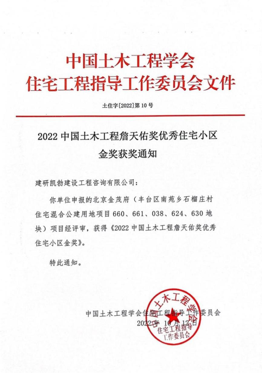 近日,中國土木工程學會住宅工程指導工作委員會公布了“2022中國土木工程詹天佑獎優(yōu)秀住宅小區(qū)金獎”評選結(jié)果,建研凱勃公司監(jiān)理的“北京金茂府(豐臺區(qū)南苑鄉(xiāng)石榴莊村住宅混合公建用地項目660、661、038、624、630地塊)”工程榮獲“2022中國土木工程詹天佑獎優(yōu)秀住宅小區(qū)金獎”。