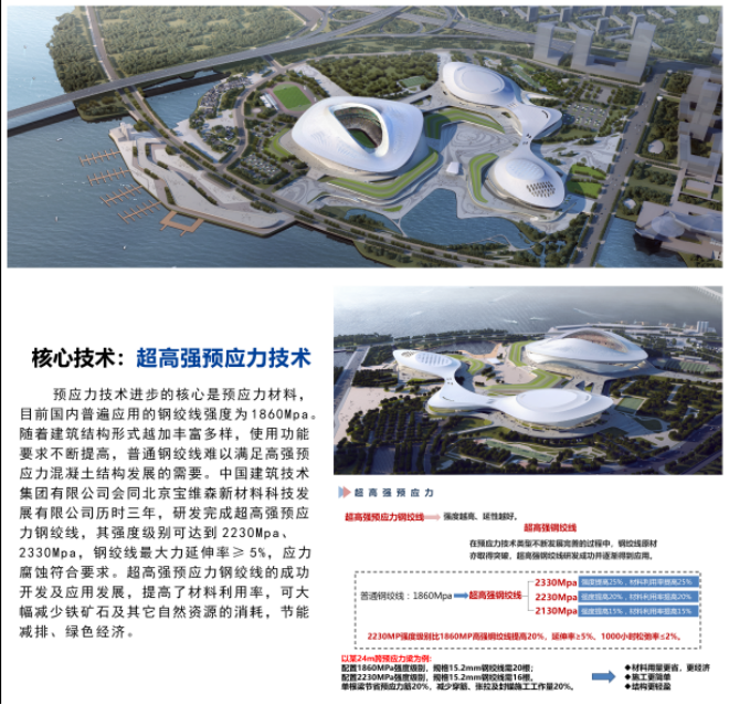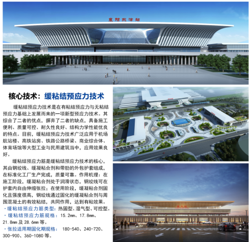 在我國鐵路、航空、公路等交通行業(yè)事業(yè)蓬勃發(fā)展的進程中,中技集團作出了積極貢獻,一是積極參與40余座高鐵客站建設,如北京豐臺南站、北京朝陽站、北京副中心站、北京大興站,“一帶一路”中緬鐵路緬甸萬象站,川藏鐵路澤當站、林芝站,中國第四代鐵路客站杭州西站、廣州白云站等,樹立了“中技預應力”優(yōu)質(zhì)品牌。二是高度重視預應力技術標準的升級,先后編制發(fā)布或在編多部預應力相關標準,如《大直徑緩粘結預應力鋼絞線》、《濕氣型緩粘結預應力鋼絞線》、《濕氣型緩粘結預應力鋼絞線專用粘合劑》、《公路橋梁緩粘結預應力混凝土結構技術指南》、《緩粘結預應力錨桿錨樁技術規(guī)程》、《超高強預應力鋼絞線》等。三是高效推進預應力科研成果轉化,創(chuàng)造了多個“國內(nèi)首個”,先后實施了國內(nèi)首個大直徑緩粘結預應力技術應用項目(高鐵安順西站站前廣場,2016年),國內(nèi)首個濕氣型緩粘結預應力技術應用項目(阜陽西站站前廣場,2018年),國內(nèi)首個緩粘結預應力錨桿技術應用項目(南海體育中心,2020年),國內(nèi)首個緩粘結預應力抗浮樁技術應用項目(化龍安置區(qū)工程,2020年),國內(nèi)首個超高強預應力技術應用項目(廈門新體育中心,2021年)。