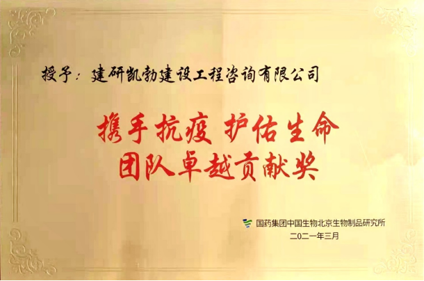 3月27日,集團公司下屬子公司建研凱勃建設(shè)工程咨詢有限公司(以下簡稱“建研凱勃”)榮獲國藥集團中國生物北京生物制品研究所頒發(fā)的“攜手抗疫護佑生命”團隊卓越貢獻獎。