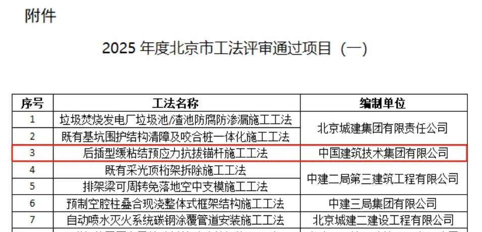 近日,由中國(guó)建技申報(bào)的“后插型緩粘結(jié)預(yù)應(yīng)力抗拔錨桿施工工法”通過(guò)了北京市住房和城鄉(xiāng)建設(shè)委員會(huì)組織的北京市工法專家評(píng)審,這一成果標(biāo)志著中國(guó)建技在技術(shù)創(chuàng)新、施工質(zhì)量和項(xiàng)目管理等方面實(shí)現(xiàn)了新的突破。