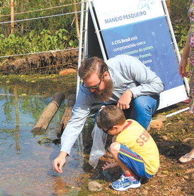 在位于巴西圣保羅州的伊利亞電站附近,三峽巴西員工帶領電站周邊社區(qū)孩子一起放流魚苗,并講解相關知識。三峽巴西供圖