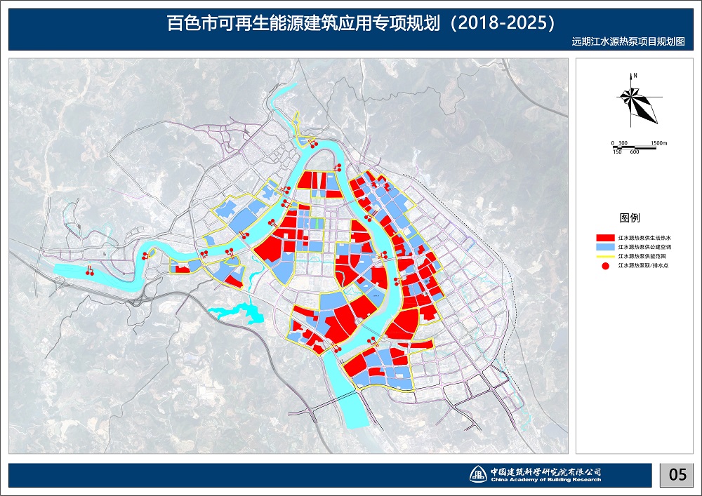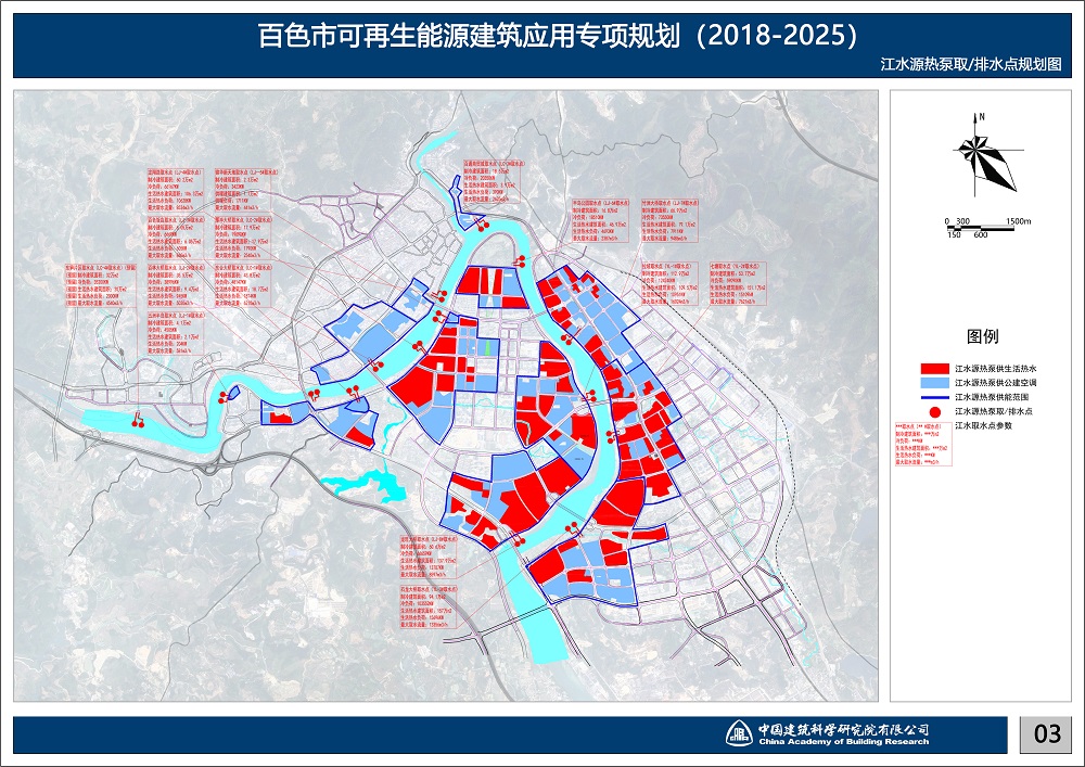 本規(guī)劃大規(guī)模應用江水源熱泵。劃針對百色市獨特的豐富水源——右江水系,專門制作江水源熱泵規(guī)劃專篇,研究江水源熱泵效率的各影響因子,以取排水點互不干擾為原則,科學排布取排水點。并根據建筑物布置確定江水源熱泵站點位置。