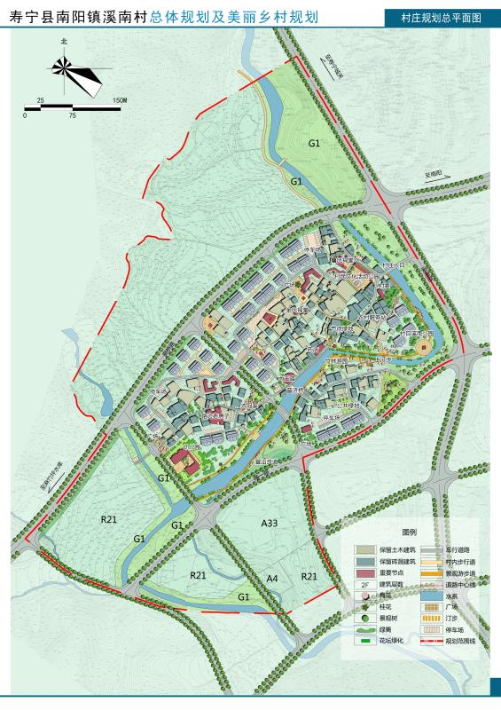 (1)結(jié)構(gòu):村莊建設(shè)發(fā)展區(qū)規(guī)劃形成“一核、一帶、五片、多點(diǎn)”——?一核:以村委、村民文化活動(dòng)公園所形成的公共核心;一帶:沿溪南村傍村而過的溪南溪所形成的濱水綠地景觀帶;五片:①依據(jù)建設(shè)情況劃分成的北部村莊居住片區(qū);②中部村莊居住片區(qū);③南部村莊居住片區(qū)與村;④西南部城市居住片區(qū);⑤城市公共服務(wù)片區(qū)