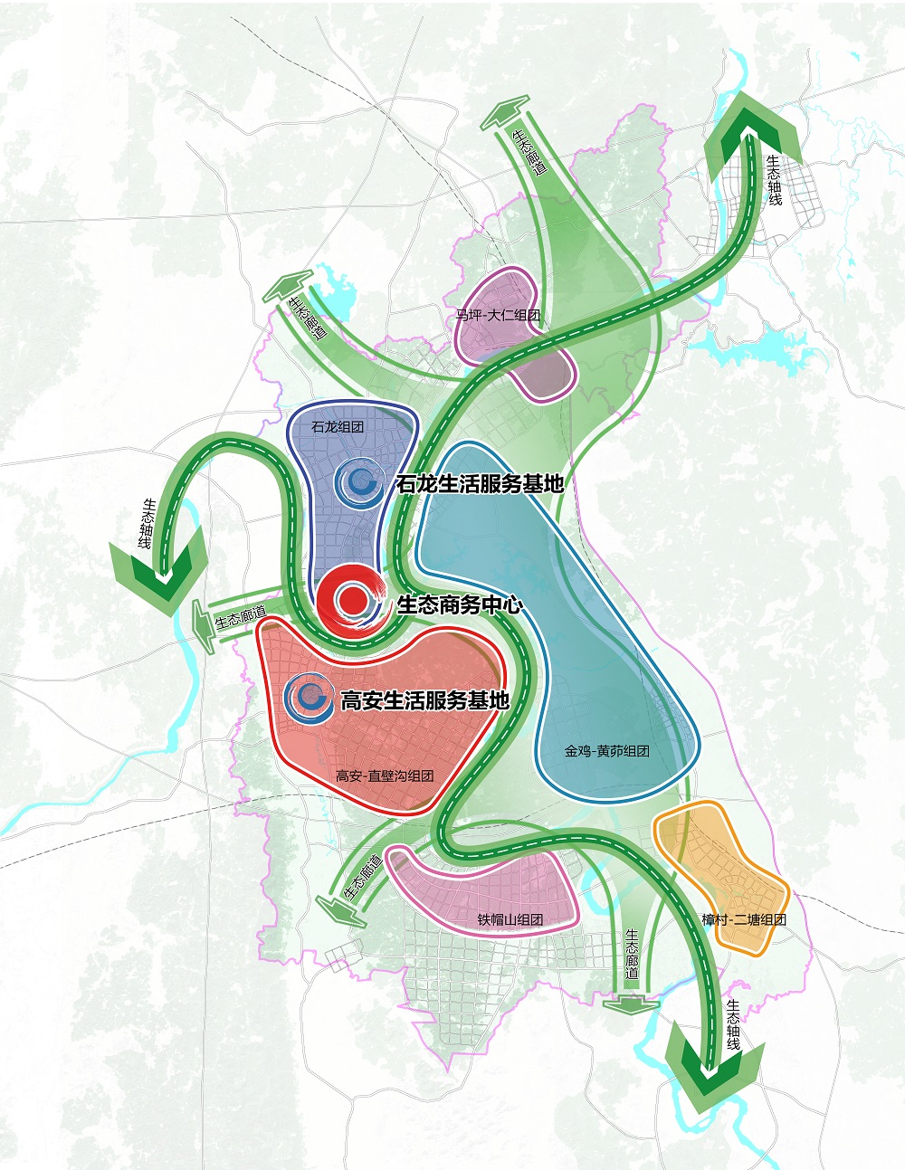 大開大合空間結(jié)構(gòu)——著眼于自然生態(tài)特質(zhì),以水為脈、綠為基、路為廊形成大開的生態(tài)空間,以高度復(fù)合的產(chǎn)業(yè)功能組團(tuán)形成大合的發(fā)展空間,構(gòu)建一個中心、兩大服務(wù)基地、三大生態(tài)軸線、五大生態(tài)廊道、六大組團(tuán)的空間發(fā)展格局。