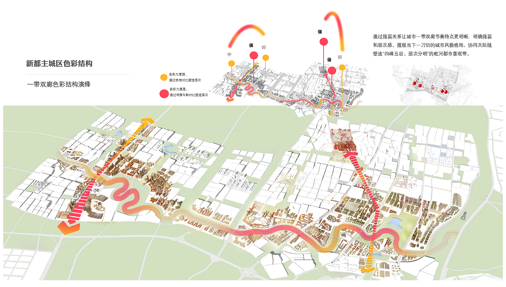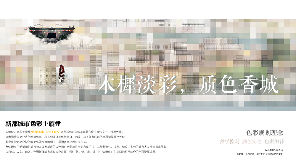 新都區(qū)城市容貌提升,是在公園城市建設背景下,追溯城市文脈、梳理城市色彩基底、尋找城市主調,以城市色彩為核心,開展的系統(tǒng)性城市形象識別系統(tǒng)提升。創(chuàng)新執(zhí)行的城市色彩、戶外外擺、戶外廣告、戶外導視系統(tǒng),將城市以點、線、面的方式,全系統(tǒng)覆蓋,通過綜合性的治理體系及樣板段示范,建立可實施可落地的管控引導。