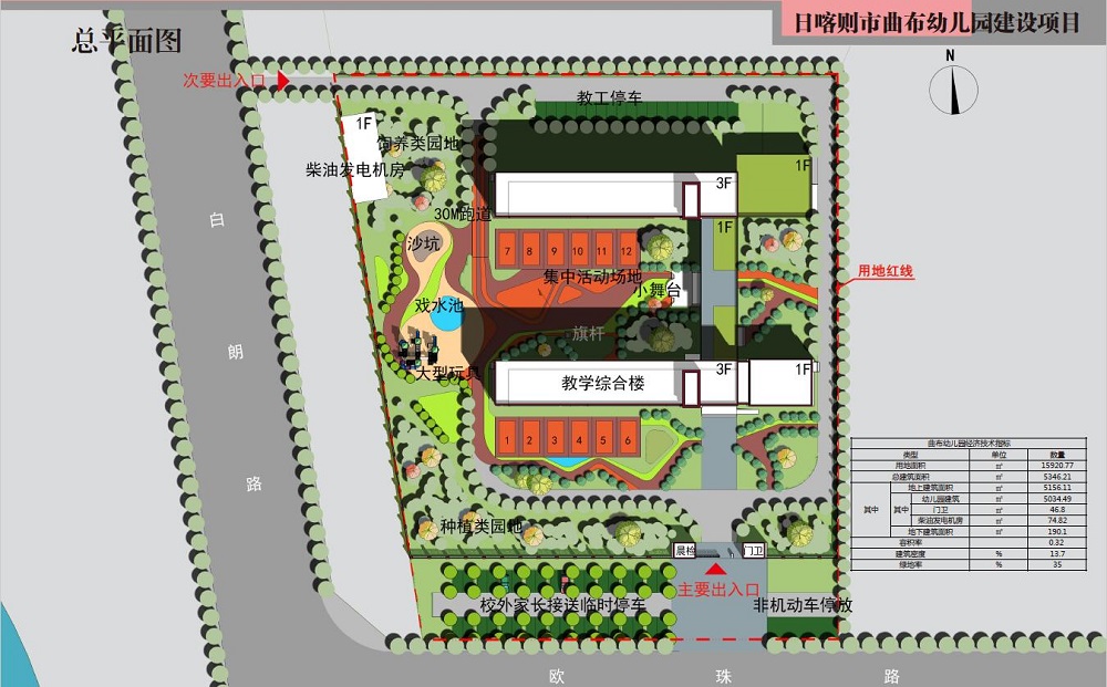 ????本項目位于日喀則珠峰開發(fā)開放試驗區(qū)教育城內(nèi),規(guī)劃為12班幼兒園,建設(shè)用地為15920.77㎡,建筑總面積為5346.21㎡,其中地上建筑面積為5156.11㎡,地下建筑面積為190.1㎡。項目用地南側(cè)為規(guī)劃道路,西側(cè)為綠化用地和規(guī)劃道路,東側(cè)和北側(cè)分別為規(guī)劃桑珠孜區(qū)第四小學(xué)和規(guī)劃園丁苑。