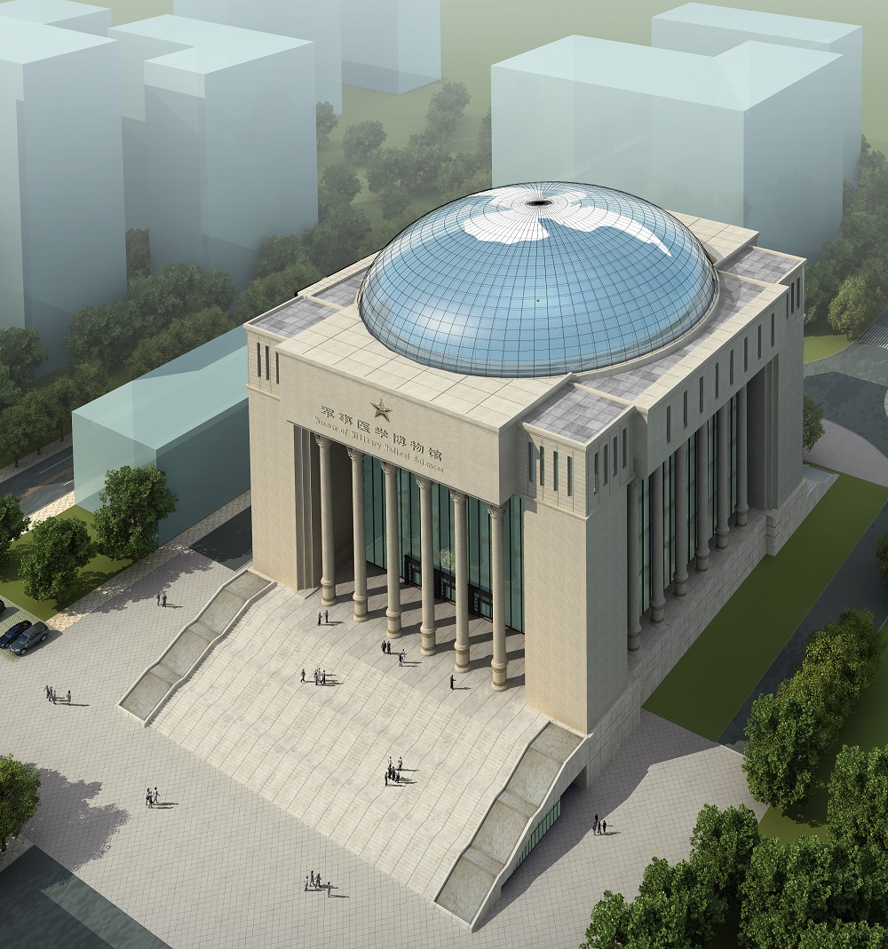 中國人民解放軍軍事醫(yī)學(xué)博物館位于北京市海淀區(qū)太平路,軍事醫(yī)學(xué)研究院內(nèi)西南角,是一座國家級大型軍事醫(yī)學(xué)類博物館。建筑用地0.873公頃,總建筑面積38000平方米。主體建筑方正,頂部圓形玻璃穹頂直徑47米,表達(dá)了天圓地方的中國文化理念。穹頂玻璃幕結(jié)合太陽能技術(shù),部分太陽能反射板組成和平鴿圖案,寓意世界和平,表達(dá)了設(shè)計(jì)的主題。
