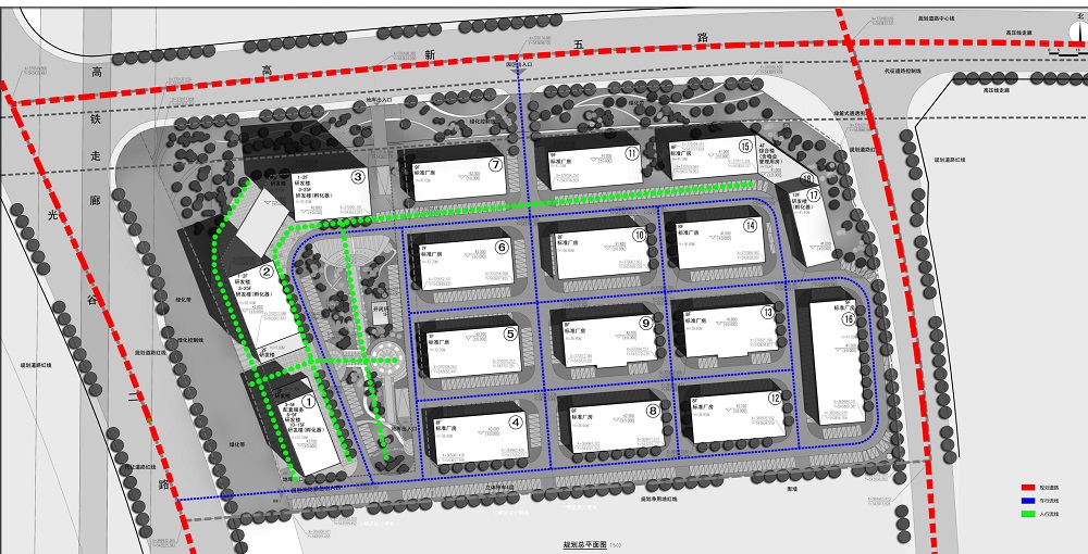 根據(jù)對場地周邊環(huán)境及場地本身的特點,結(jié)合高新區(qū)規(guī)劃局的規(guī)劃設(shè)計要求,本方案分別在光谷二路及高新五路布置主要出入口,結(jié)合中心花園設(shè)計,通過南北、東西方向兩條主要視覺景觀軸線塑造園區(qū)良好的景觀形象。從而打造高檔建筑標(biāo)準(zhǔn),優(yōu)異的環(huán)境品質(zhì)新型高端研發(fā)生產(chǎn)園區(qū)。建筑空間布局北高南低,在高新五路與光谷二路交叉口處設(shè)置兩棟標(biāo)志性25層孵化器研發(fā)大樓。沿高新五路設(shè)置9層研發(fā)車間,基地內(nèi)部建筑層數(shù)高低錯落,整個建筑群天際線變化豐富。